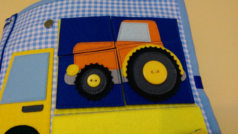 На обложке грузовик, в нем пазл-трактор(на липучке).