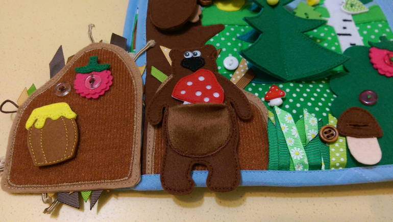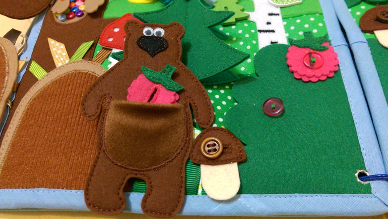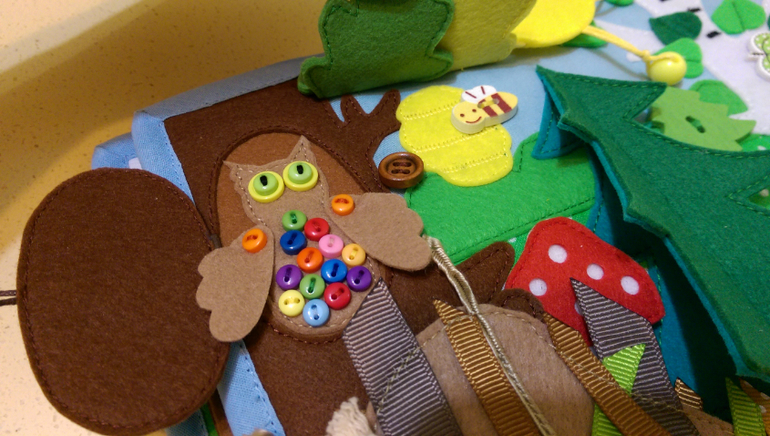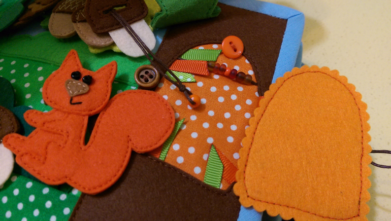 Белка крепится в дупле на магнит. Она сушит орешки, грибы, ягоды( просовываем в отверстия, тренируем пальчики))) .