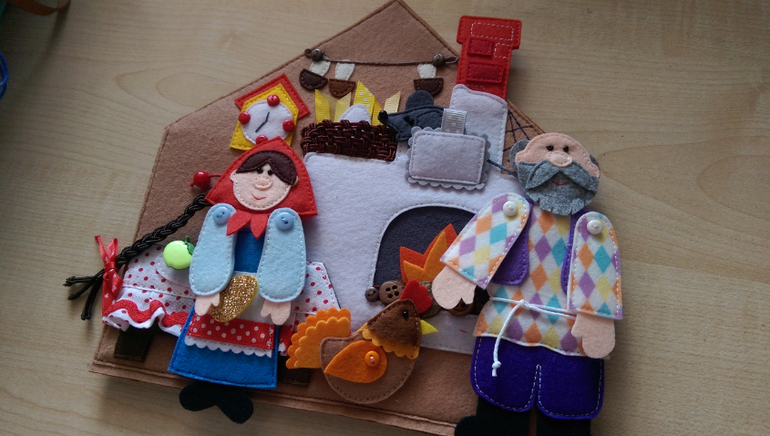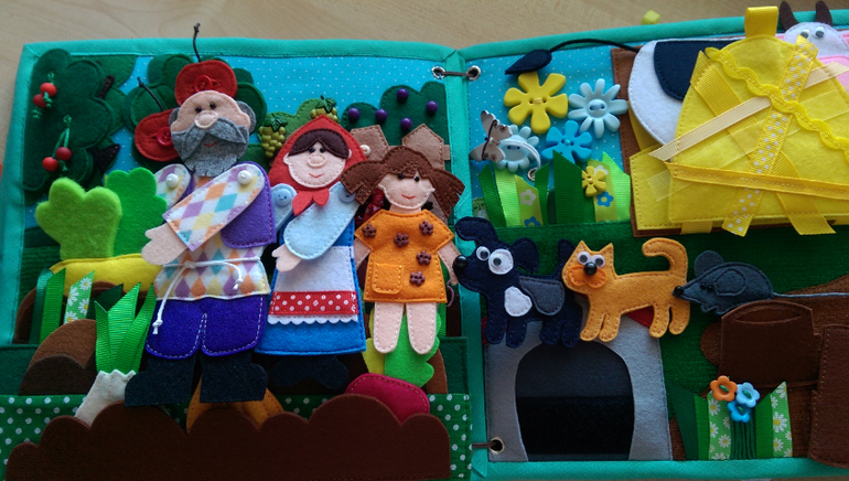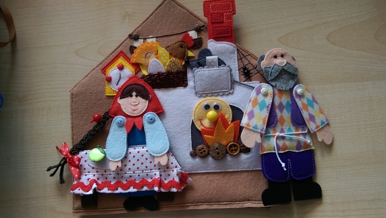 Эта книжка была сшита для девочки, в подарок на 1 годик. В ней есть любимые сказки, формы, цвета, застежки и много чего интересного. Далее много фото.