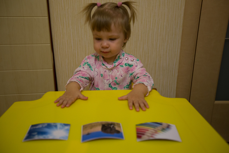 Мы играем так. Сначала прошу Катюшу посмотреть на меня, говорю "Мне нравится одна картинка, сейчас я тебе скажу какая". мысленно передаю образ выбранной картинки. Потом достаю обе карточки и спрашиваю "Какая картинка маме нравится?"