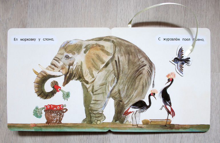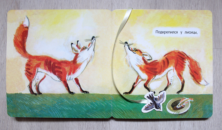 Книжка-картонка с закладкой в виде воробья, которого можно сажать на страницы книги - в тарелку лисицы или в корытце журавлей - такое оживление книги дети очень ценят. А какой в конце объемный крокодил, прямо вылезает из книги! В общем, как дождетесь скидку, смело берите, а так цена безбожная...