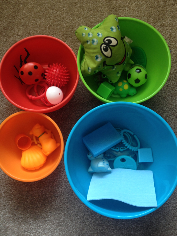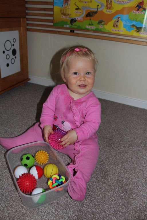 Делала коробочку с разными мячиками-шариками - разные размеры, формы, цвета, материал, звук, все проговаривала.