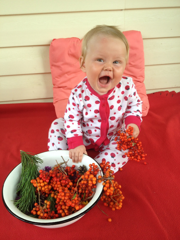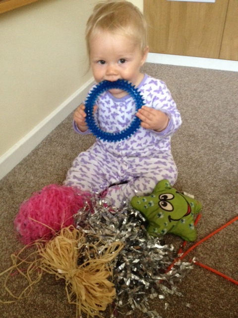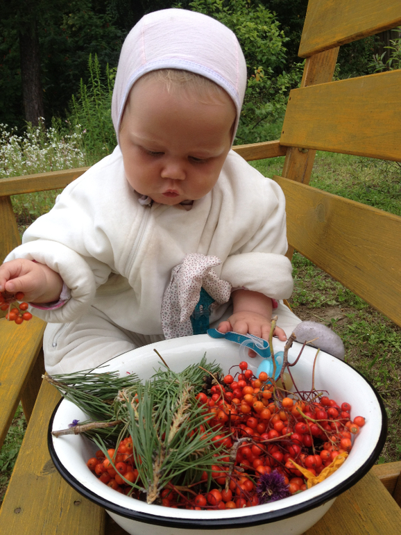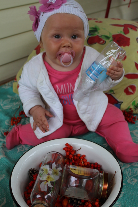12. Сенсорные коробки - мне очень эта тема нравится. Самая первая коробочка у нас была на даче, в 7 мес из рябины, шишек, шиповника, елок и т.д. Очень хорошо пошла. Я не ожидала, но дочка могла каждый день минут по 40 копаться. Позже добавила несколько бутылочек, делали погремушки. Я сидела рядом всегда, иногда давала соску, чтобы в рот не тянула.