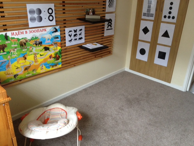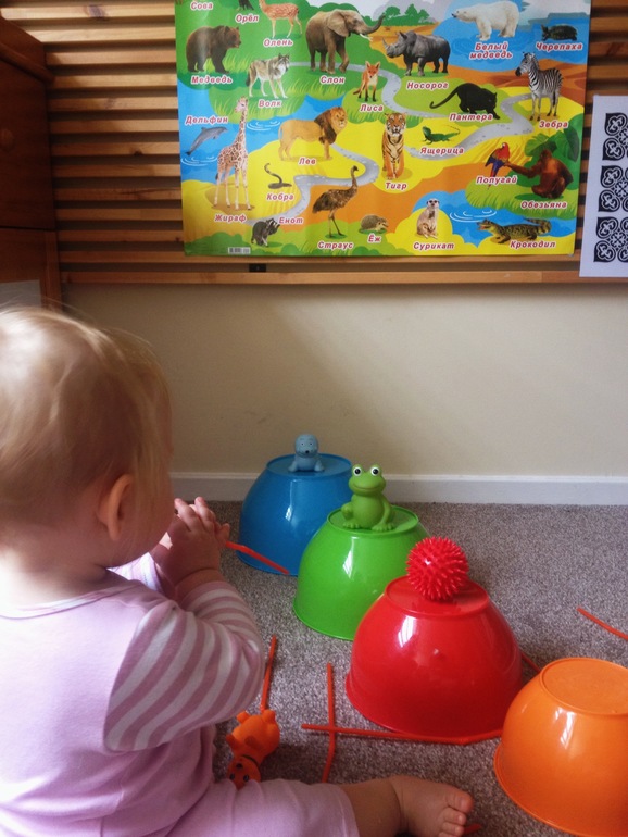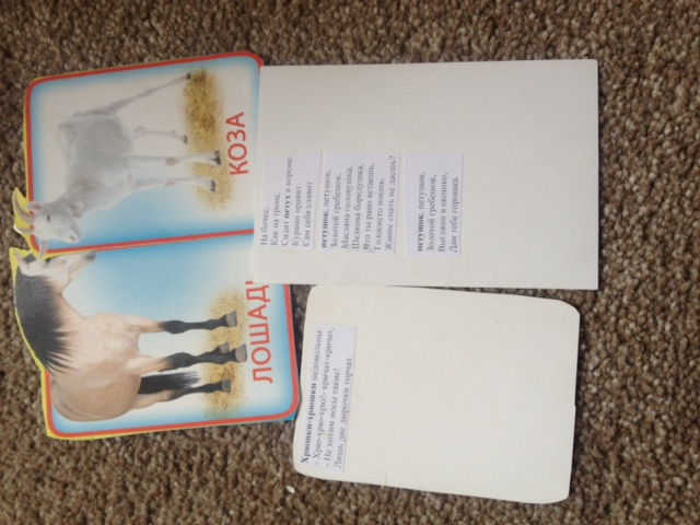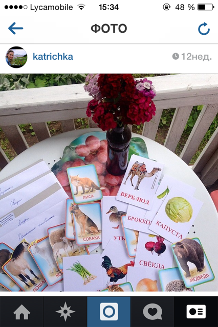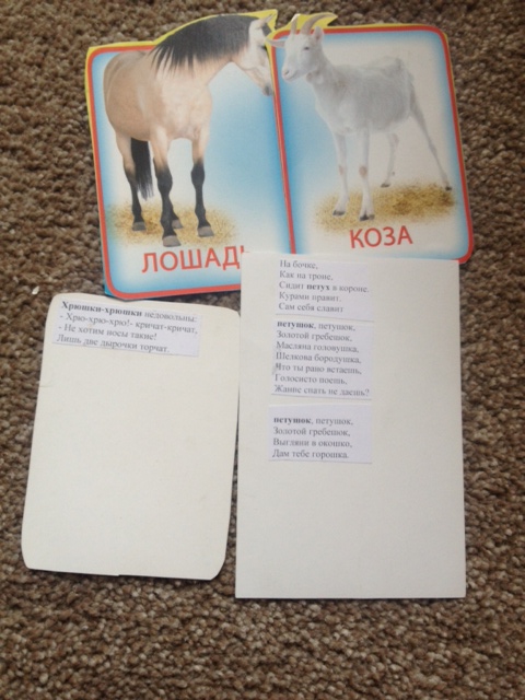 8. Смотрим карточки несколько раз в день. Карточки я делала сама - распечатывала с разных сайтов, к каждой карточке искала подходящий стишок, песенку или потешку, наклеила на обратную сторону. Дочка смотрит на картинку, а я читаю стих. Карточки показываю не по методике Домана, не для обучения чтения, а просто отвлечь, новый формат преподнести стишки. Малышке нравится. На карточки смотрит, задерживает внимание, разглядывает. Иногда пытается выхватить, но редко. Обычно продолжает заниматься своими делами, а я показываю. Пока смотрим три комплекта - домашние животные, лесные животные и овощи, но у меня тем 10-15 заготовлено.