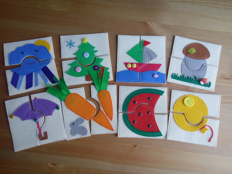 Можно сказать сенсорные пазлы, на каждой фигурке есть пуговки, бубенчики и другие фенечки. Шились для младшей дочки, ей год и пять. Пока только рассматривает картинки или пытается что-нибудь оторвать:)