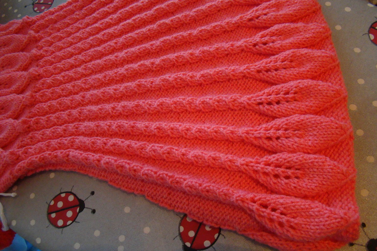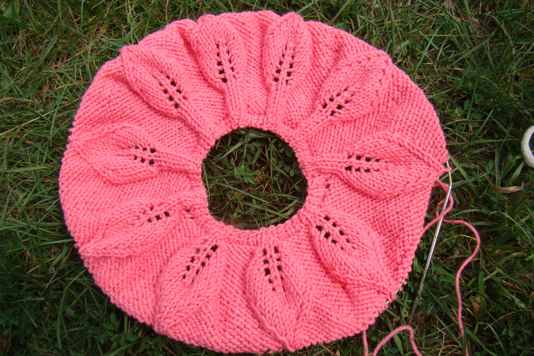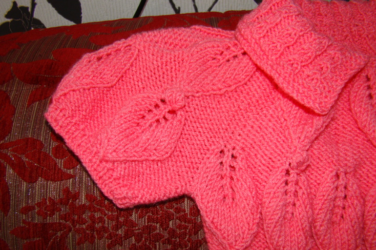 проймы поднимаем еще 4 петли. Когда листочек связан, заканчиваем 6 рядами полой резинки. Рукав я вязала
