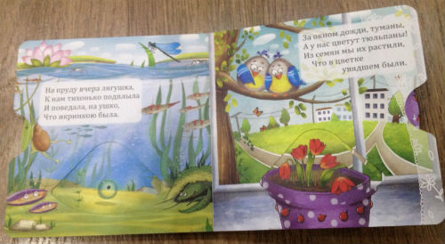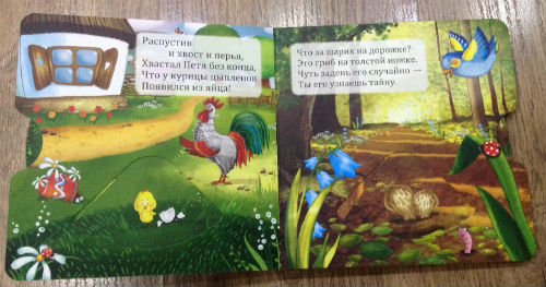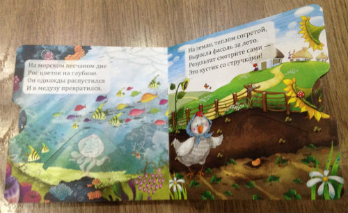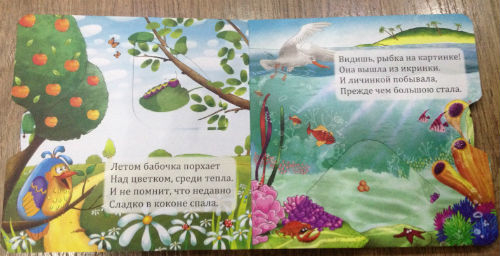 Крутим сбоку колечко и смотрим "мультики" о том, как появляются на свет животные и растения, а именно: божья коровка, бабочка, рыбка, петух, гриб, лягушка, тюльпан, медуза, фасоль.