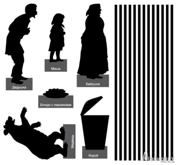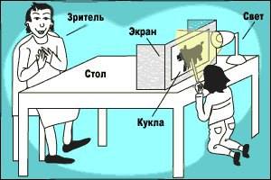 При показе держите куклу близко к экрану, чтобы получился четкий силуэт. Источник света - лампа - должна стоять между экраном и кукловодом. Декорации должны быть также плоскими, их силуэт должен хорошо читаться.