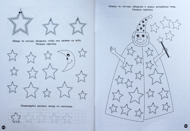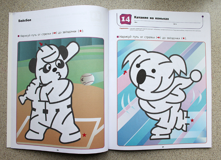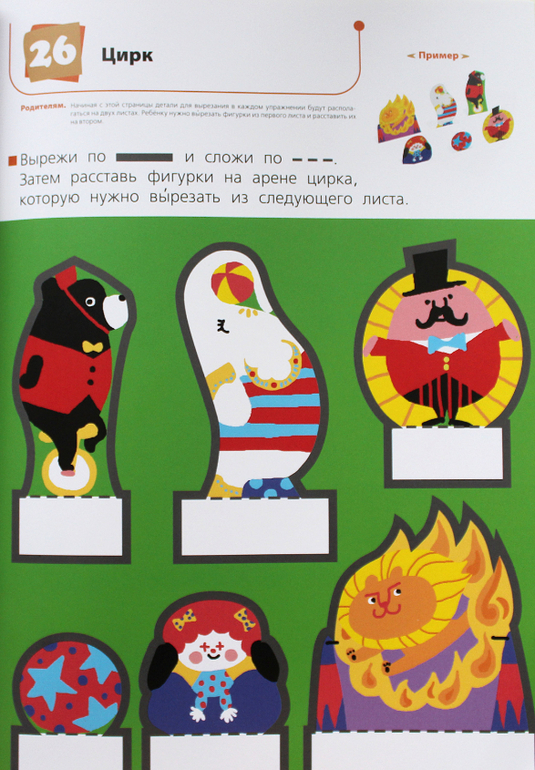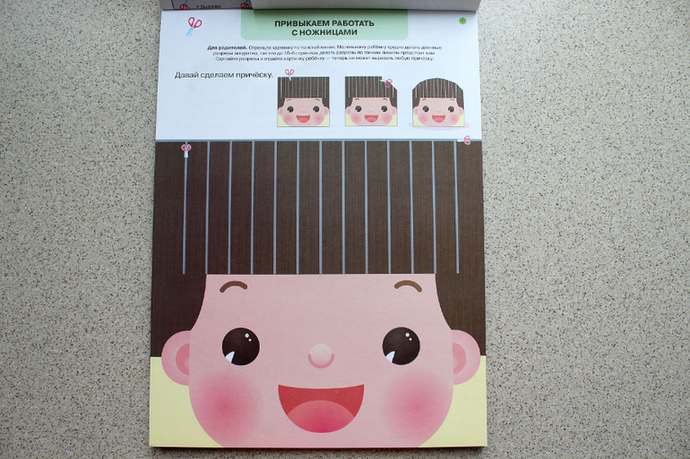 Тут в каждом задании есть элемент игры, и помимо задний, где нужно совершенствовать навыки вырезания ножницами, нужно еще и сложить или приклеить и получаются небольшие декорации для игры.