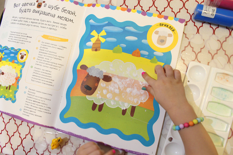 Задания довольно простые, но если ваш ребенок нервничает, когда делает что-то более сложное, здесь он отдохнет, сделает то, что ему точно по силам. Дорисовать шерсть барашку или колеса машинам, украсить рамку и т.д. Плюс на странице есть несколько вопросов, устных заданий и иногда нужно приклеить наклейки.