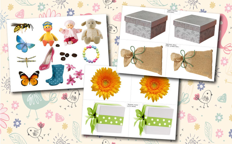 1 лист ( 2 парных картинки-пряталки и 8 изображения, которые нужно прятать)