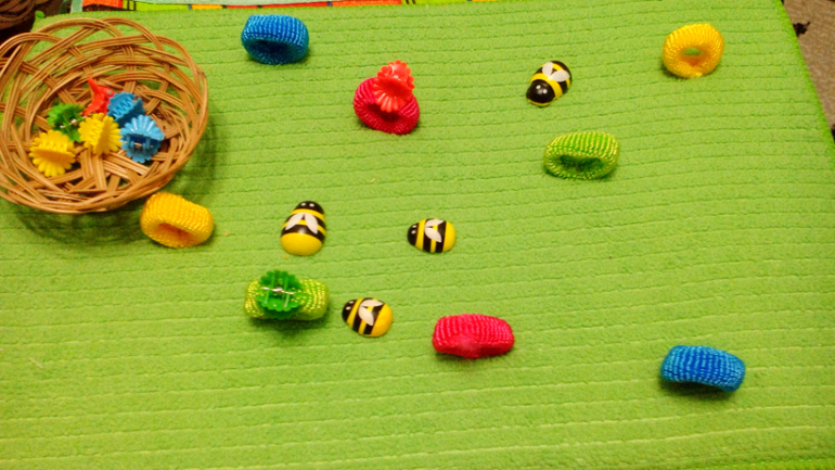 15. Идея опять с сайта maam.ru Пришиваем резиночки к ткани, прицепляем к ним заколочки (цветочки) нужного цвета. У нас это пчелки собирали нектар))