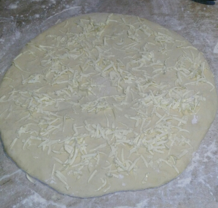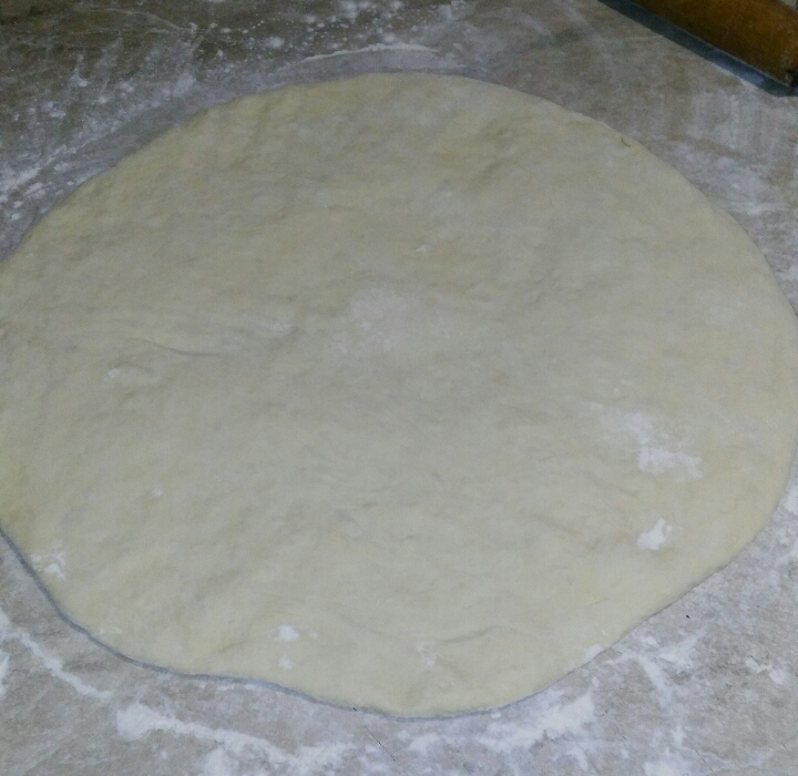 Тесто уминаем, используя муку для подпыла, раскатываем из теста круг толщиной примерно в 1 см.