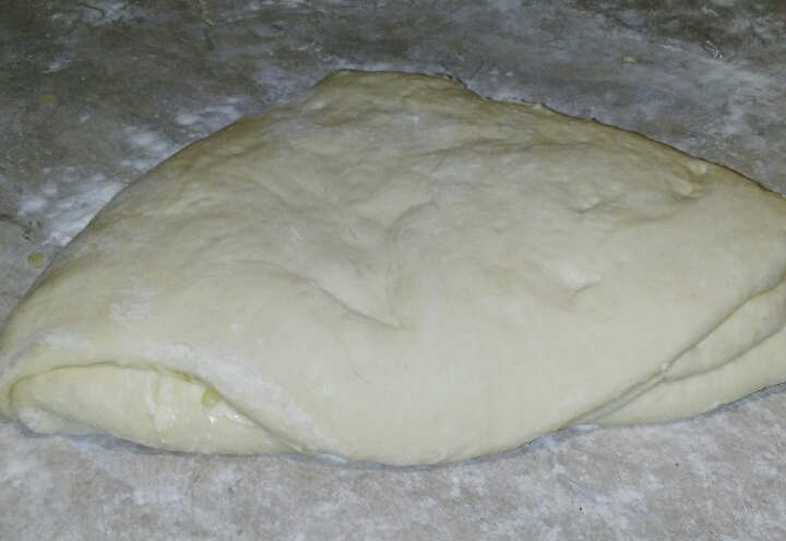Тесто снова раскатываю в круг толщиной примерно в 1 см, снова дважды складываю. Тесто накрываю пленкой и оставляю на 20 минут.