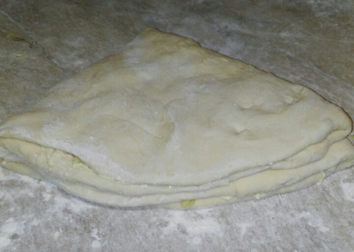 Картофельный слой чуть прижимаем руками к тесту, складываем тесто пополам, затем еще раз пополам. Тесто накрываем пленкой и оставляем примерно на 20 минут.