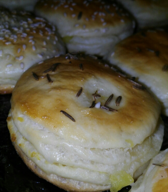 Слойки укладываю на противень, смазанный растительным маслом, накрываю их пленкой и даю им увеличиться в объеме примерно в 2 раза. Смазываю сверху слойки чуть взбитым яйцом. Одну часть слоек я посыпала тмином ,а вторую кунжутом.
