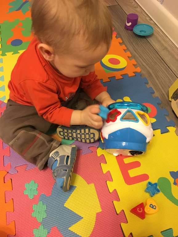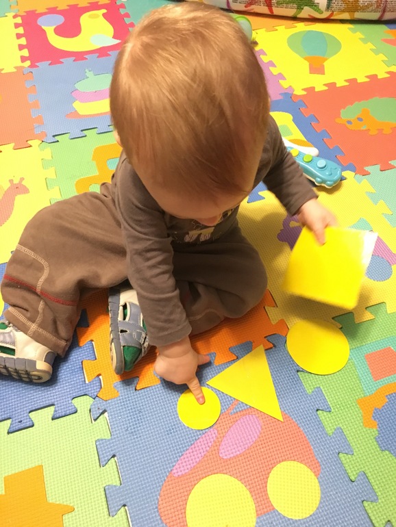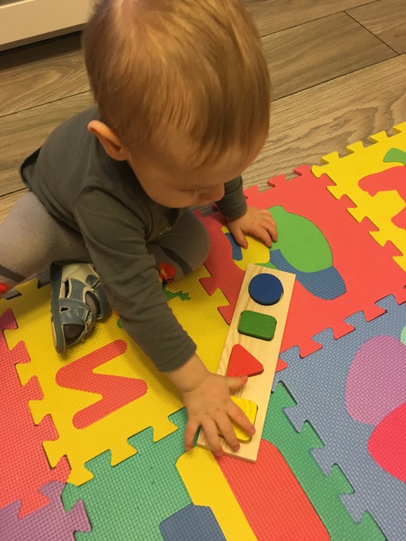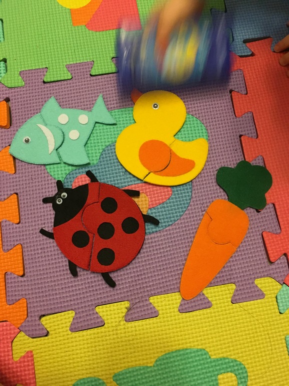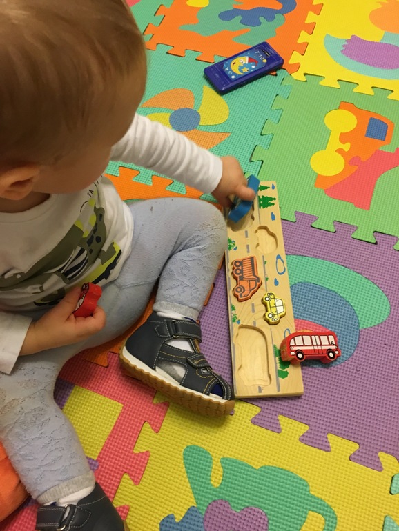 Логика: пазлы. У нас это пазлы из фетра из двух частей. Пока просто ознакомились. Ваня ломал, мама-соединяла