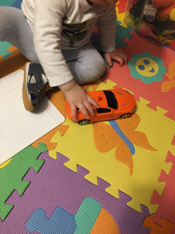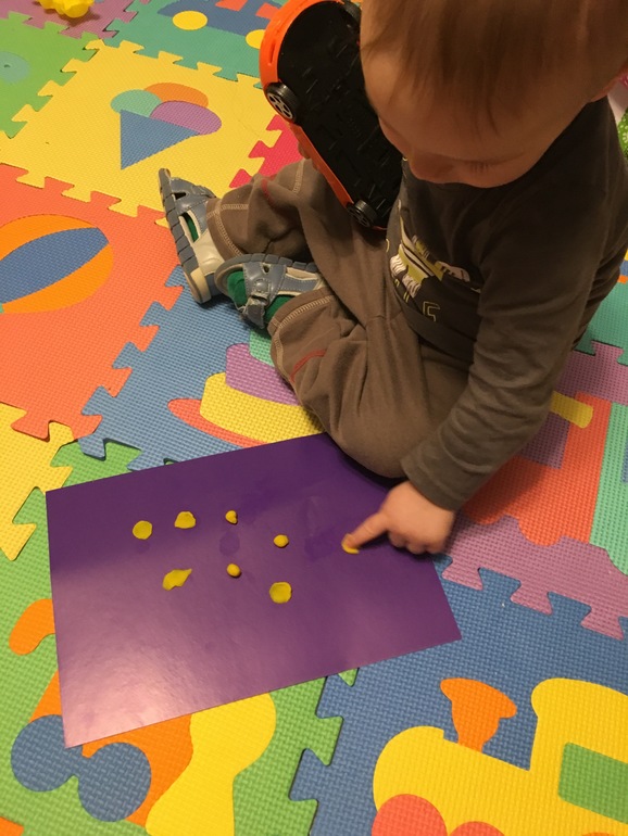 И давили пальчиком шарики из пластилина. Пока делает не очень охотно. Понравилось машинкой ездить по шарикам и давить их)))