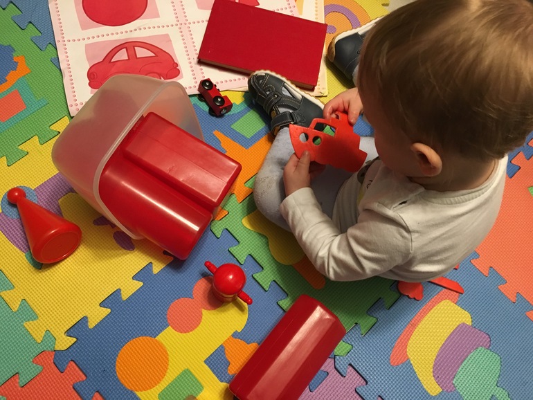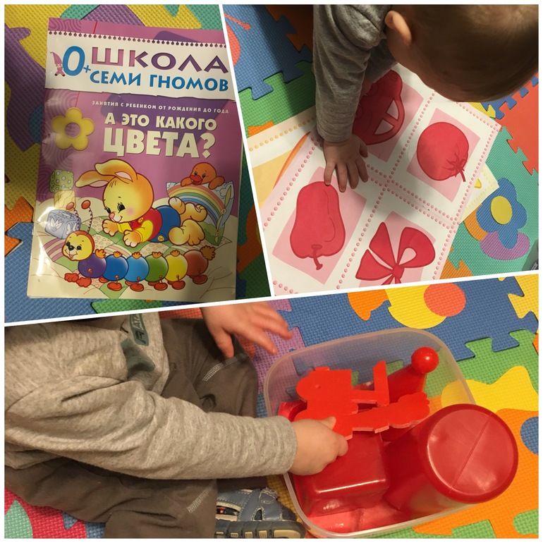 После обеда «цвет»-красный. Сначала посмотрели книгу из Ш7Г, потом ходили по квартире и искали предметы красного цвета. Это самое любимое занятие. Предметы складываем в контейнер, дно которого я обклеила красной бумагой.