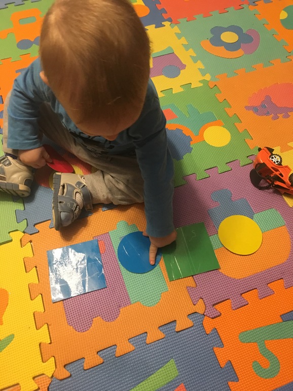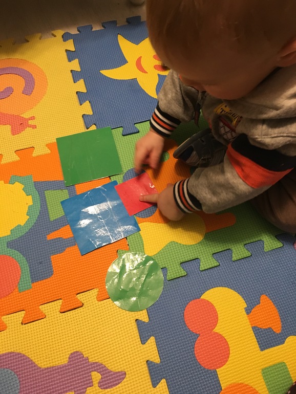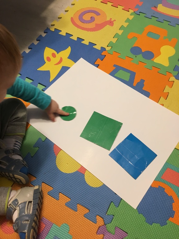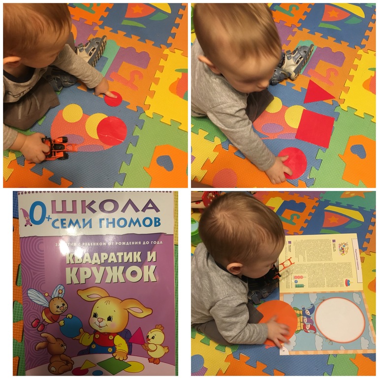 До обеда «форма»: смотрели « круг» и пробовали искать его среди других фигур. Для этого я вырезала из картона 3 основные геометрические фигуры разных цветов. Материал обклеила скочем, но уже посматриваю на пленку для ламинирования в домашних условиях. Плюс начали просматривать книгу из серии Ш7Г.