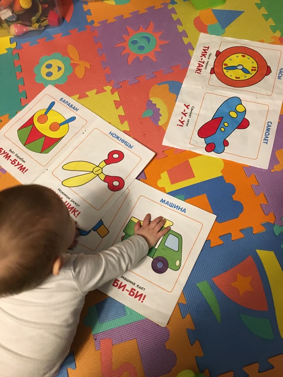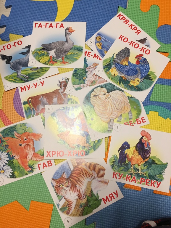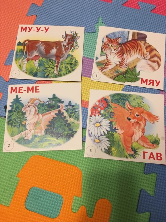 4. Речь: до обеда посмотрели карточки с домашними животными и слушали, какие звуки они произносят. Пока Ваня иногда выдает звук мычания коровы)