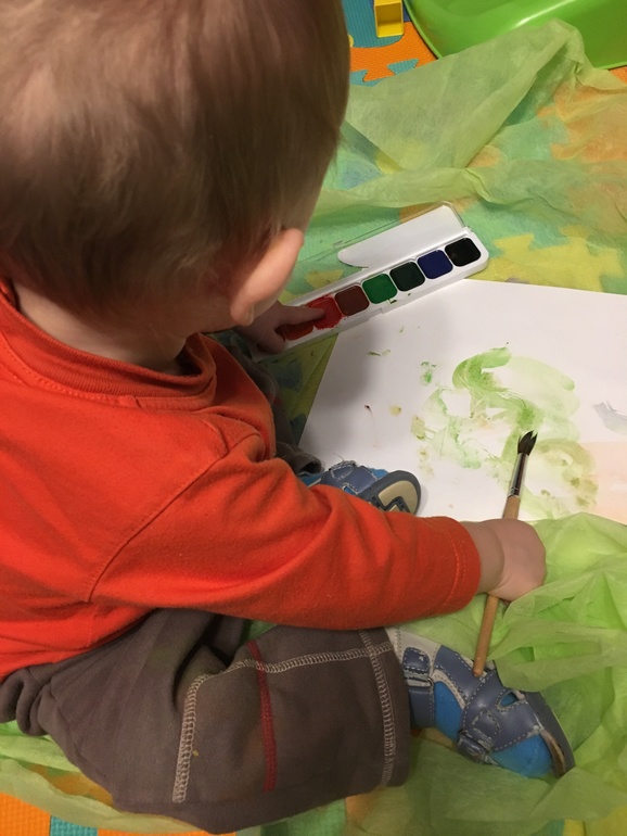 Творчество: рисовали красками. Сам пока не стремится, я рисовала его рукой.