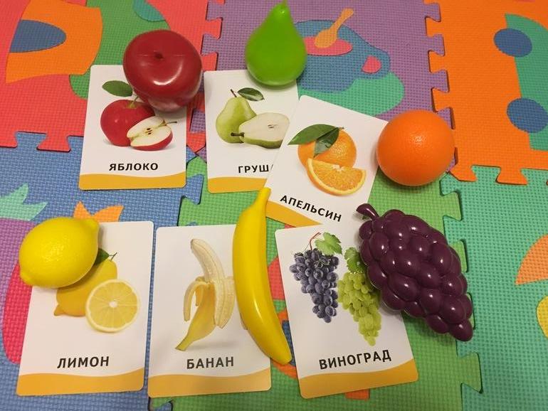 Окружающий мир. Фрукты. Смотрели карточки, играли в игрушечные фрукты, грузили в грузовик, кормили слона.