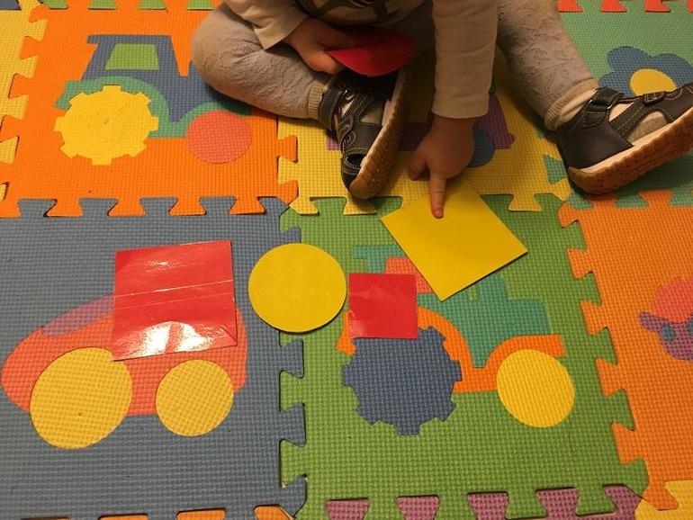 Форма - квадрат. Искали квадраты среди кругов. Пробовали катать квадраты и круги. Сравнивали.