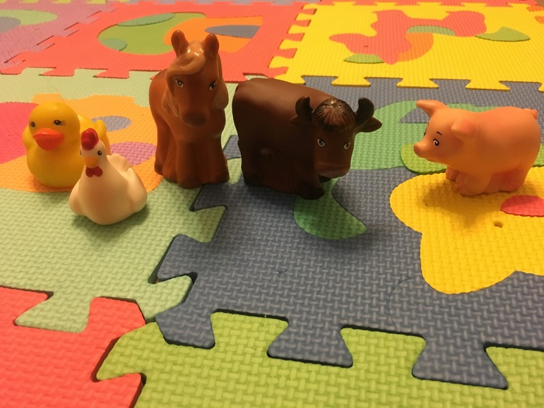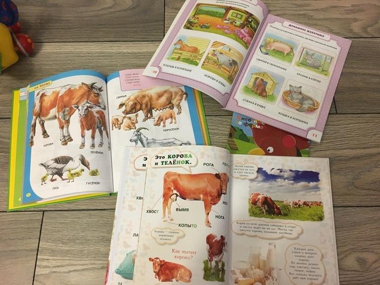 Окружающий мир: животные фермы. Карточки, книжки по теме в течение дня, вспоминали звуки животных и искали фигурки.