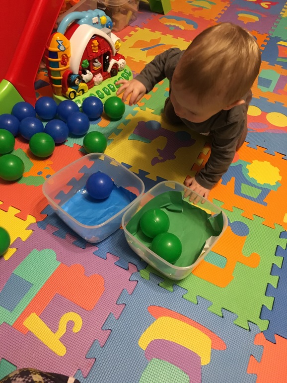 Сесорное развитие. Цвет: зеленый и синий. Пробовали раскладывать шарики в контейнеры по цвету.