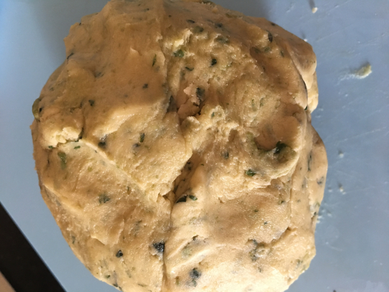 Перемешать все Чехией ингредиенты для теста. Добавить к ним базилик . Перемешать хорошо. Масло порезать кубиками. В процессоре/блендере смешать масло и мучную смесь. Если нужно добавить ледяную воду. У меня и без воды хорошо слепился колобок теста.