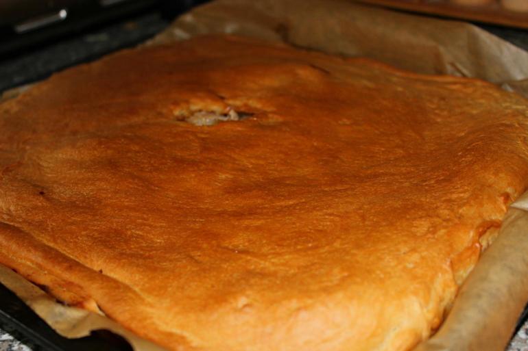 Накрываем верх, делаем не большую дырочку по середине, и смазываем 1 желток+1чл воды. Выпекаем в духовке при 180 градусах 45 минут-1час. Если верх будет быстро запекаться, накрыть фольгой.