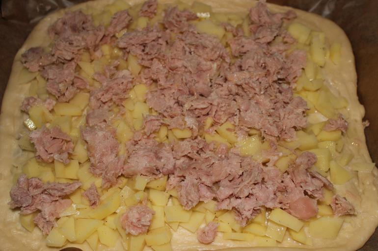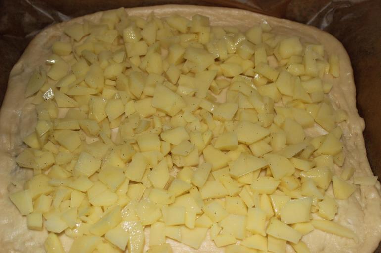 Тесто делим на две части, расскатываем низ, выкладываем мелко нарезанный картофель.