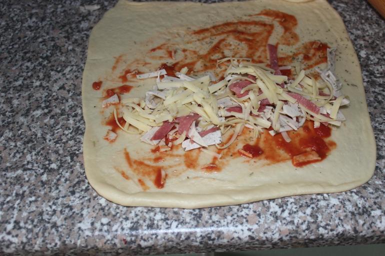 Смазываем томатным соусом и выкладываем сыр и ветчину.