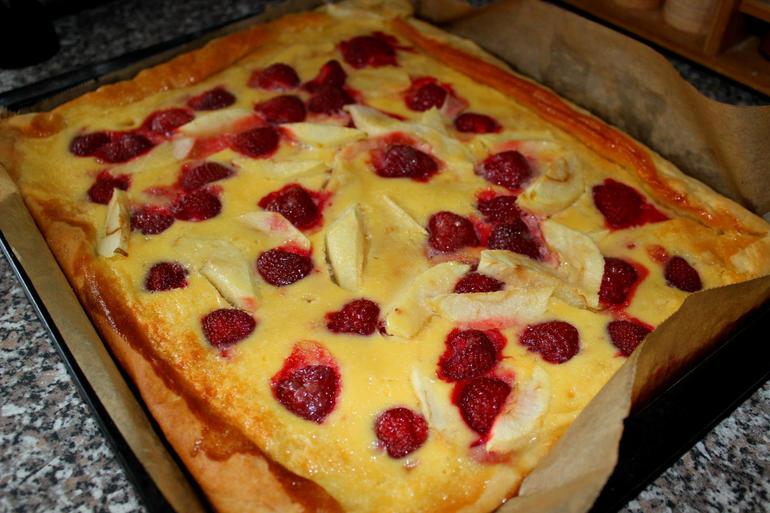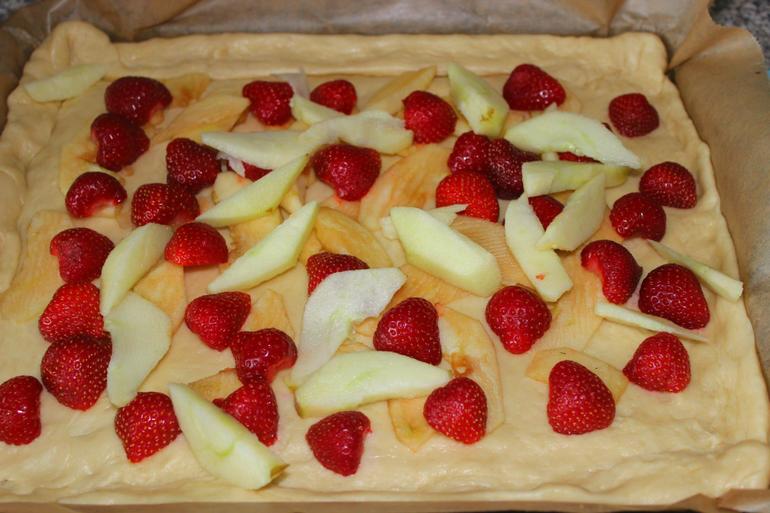 Смешиваем сметану, яйца, сахар и ванильный сахар, хорошо перемешиваем и заливаем пирог. Выпекаем при 180 градусах 39-40 минут.