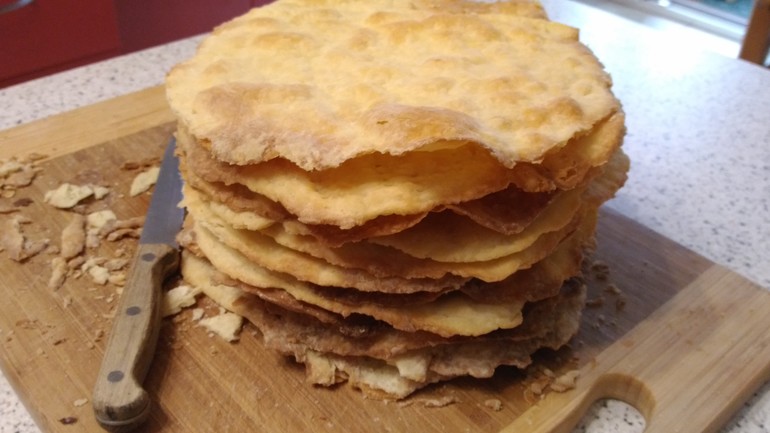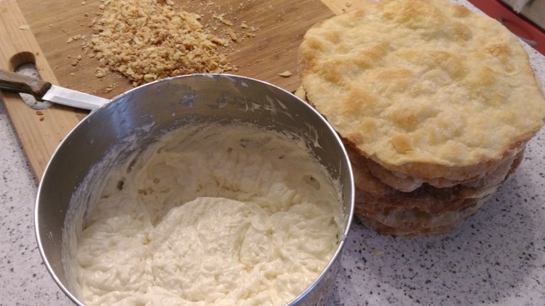 5. Выпекать коржи по одному или по два в духовке на бумаге или силиконовом коврике при 180-200 градусах 5-10 минут.Предварительно наколоть вилкой. Готовые коржи сложить стопочкой.