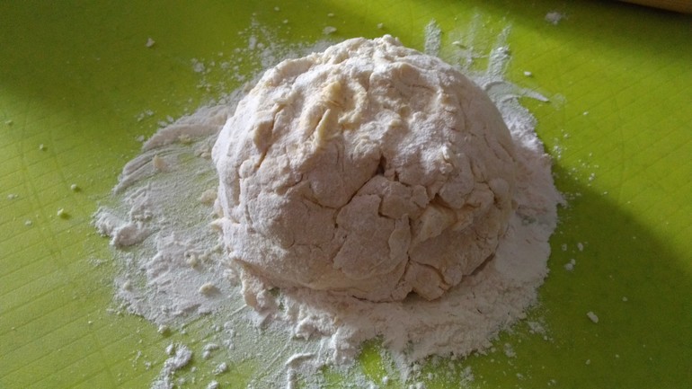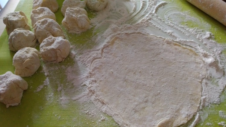 4. Разделить тесто на две части, каждую сформировать в валик. Разрезать каждый валик на 6 частей, т.е. всего должно получиться 12. Убрать в холодильник и по одному доставать, раскатывать и выпекать