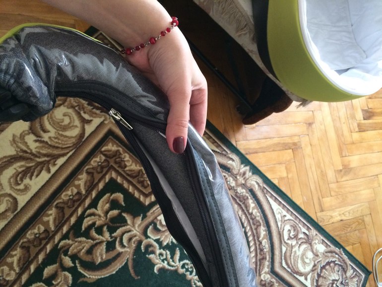 б) Ручка. Она покрыта плотной прозрачной штукой, что бы не пачкаться. Я думала, она снимается, и там остается ткань как на коляске. Ан нет, там пенопласт внутри. Жаль, мне эта блестящая вещь не нравиться, хотя может она и практичная.Фото под кат. Ктати, с молнией поаккуратнее, она заедает пенопласт.