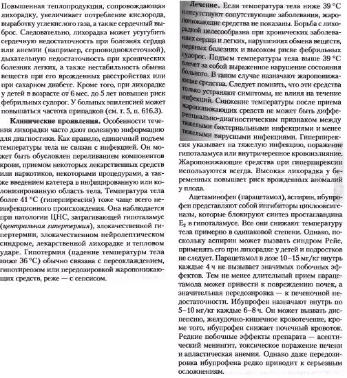 "При повышении температуры тела у больного ребенка необходимо решить вопрос: надо ли снижать температуру? В соответствии с рекомендациями ВОЗ, жаропонижающую терапию исходно здоровым детям следует проводить при температуре тела выше 38,5°С. Однако если у ребенка на фоне лихорадки, независимо от степени выраженности гипертермии, отмечается ухудшение состояния, озноб, миалгии, нарушения самочувствия, бледность кожных покровов и другие проявления токсикоза, антипиретическая терапия должна быть назначена незамедлительно. Дети из «группы риска по развитию осложнений на фоне лихорадки» требуют назначения жаропонижающих лекарственных средств при «красной» лихорадке при наличии температуры выше 38°С, а при «белой» - даже при субфебрильной температуре.