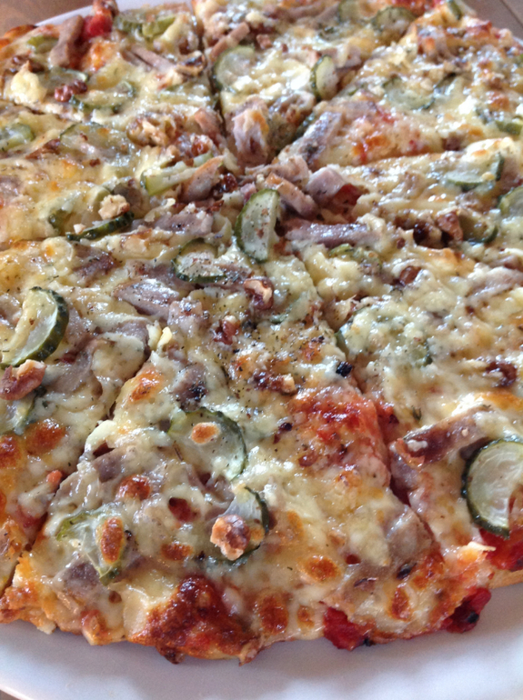 Начинку я делаю всегда разную, соус готовлю из томатов в собственно соку. Особым спросом пользуется сладкая пицца (вместо соуса - сметана, бананы кружочками, консервированные ананасы - режу кусочками и сверху обильно посыпаю сыром).