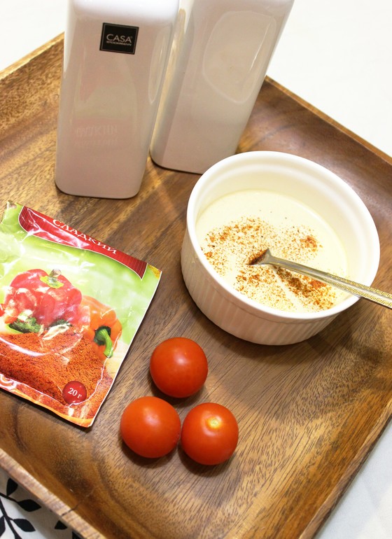 Соус очень простой, пропорции не даю, т.к. делаю всегда на глаз: нежирная сметана, соевый соус (примерно 1/4 по отношению к сметане), долька-две чеснока, паприка (сладкий перец).