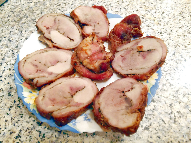 Духовку разогреть до 180 градусов и поставить рулет. Запекала 1 час 15 минут. У меня кусочек был небольшой (грамм 700-800), если больше, то запекаем дольше. Остужаем. Можно кушать, как в горячем виде, так и в виде нарезки на бутерброд. Жир вытопился и осталось вкусное мясо.