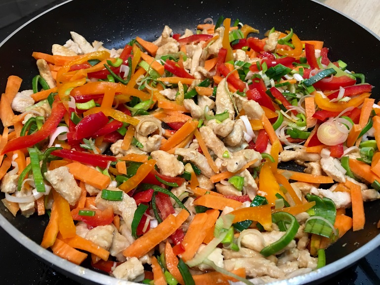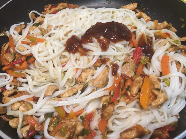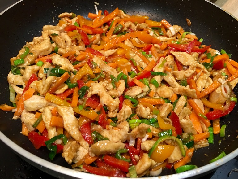 Режем куриное филе продолговатыми кусочками и обжариваем на сковороде. Когда курица немного поджарилась добавляем немножко соуса Терияки и ещё немного карамелизируем.