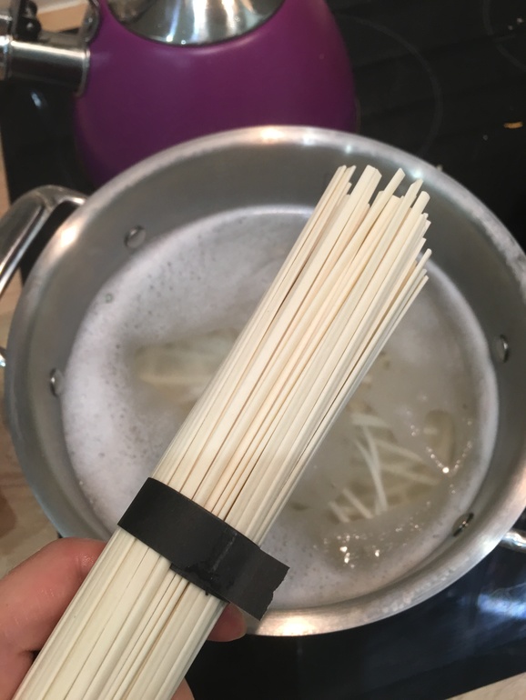 Кидаем лапшу в кипящую, подсоленную воду. Варить лапшу удон не более 4 минут иначе потом она становится рыхлая и ращваренная. Лучше следить все время за её структурой.