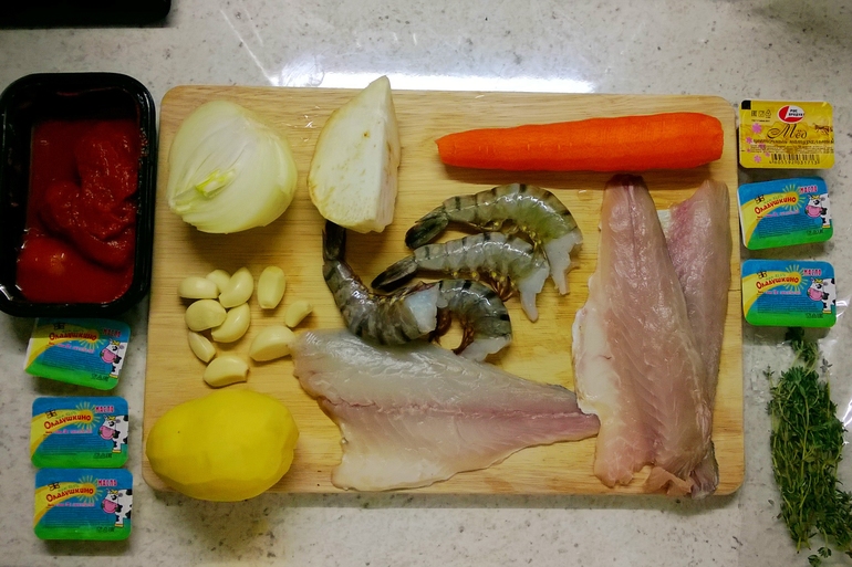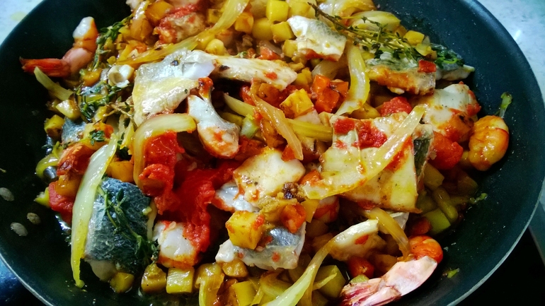 На овощи выложить тимьян, рыбу, креветки, разложить масло, полить медом, посолить, поперчить и добавить размятые томаты. Сковородку запекать в разогретой духовке минут 15-25(в зависимости от духовки).
