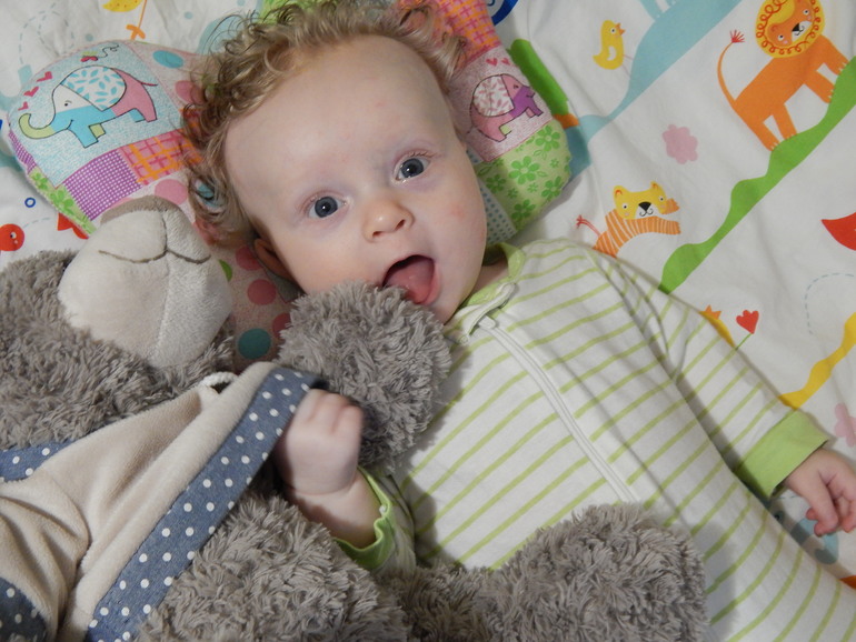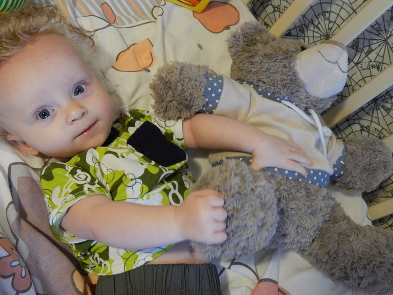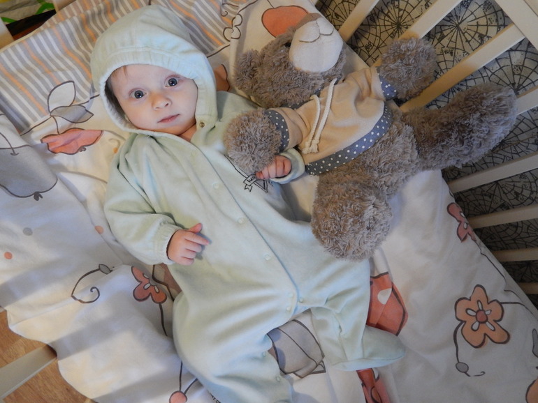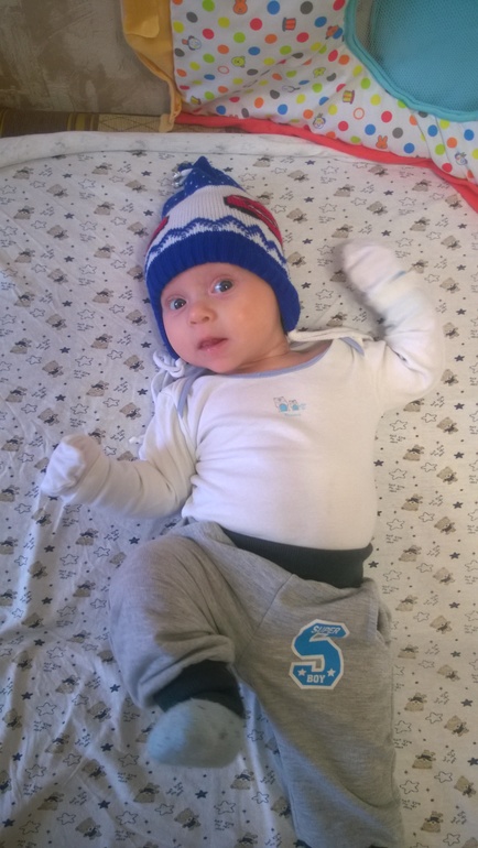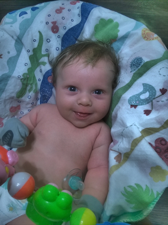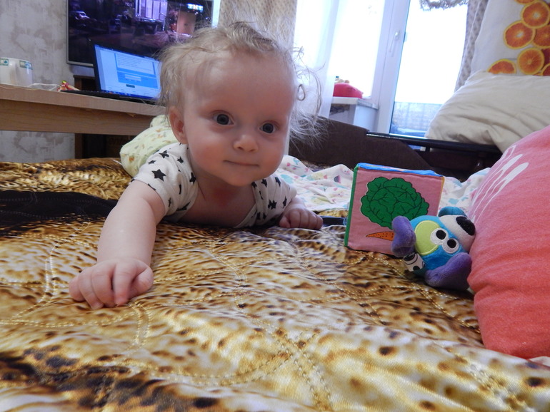 Из наших достижений: переворачиваемся на бочок , пытаемся перевернуться со спинки на животик, вовсю гулим, берем в ручки игрушки и пытаемся засунуть их в рот, пищим как ультразвук, улыбаемся папе и маме, следим за собакой, научился высовывать язык