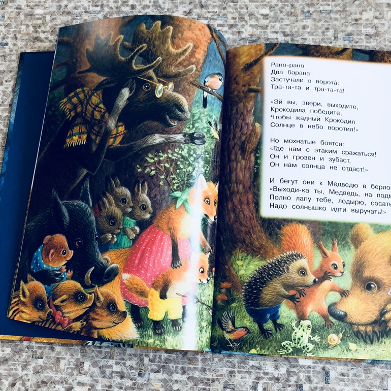 Ну а эта вообще-то не планировалась, но очень понравились рисунки, ну а потом это же Чуковский! Три произведения: телефон, краденное солнце и путаница. Книга большая, мелованная ( листает, водит пальчиком под моим контролем, слушает первые четверостишии)