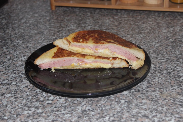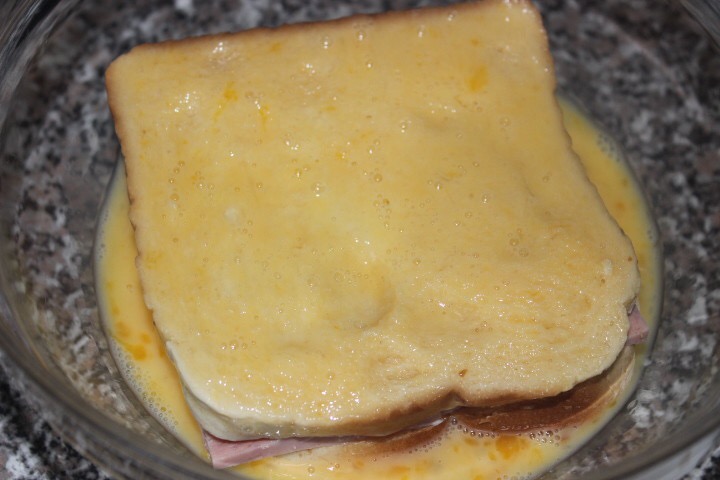 Обмакиваем наш бутерброд в кляре, держим секунд 30 с каждой стороны для пропитки, сковороду смазываем маслом совсем чуть чуть, можно на сковороде для гриля, вообще без масла и обжариваем с каждой стороны по паре минут, немного прижимая его лопаткой, что бы кусочки верхнего и нижнего кусочка хлеба, хорошо склеились между собой. И разрезаем бутерброд на треугольники.