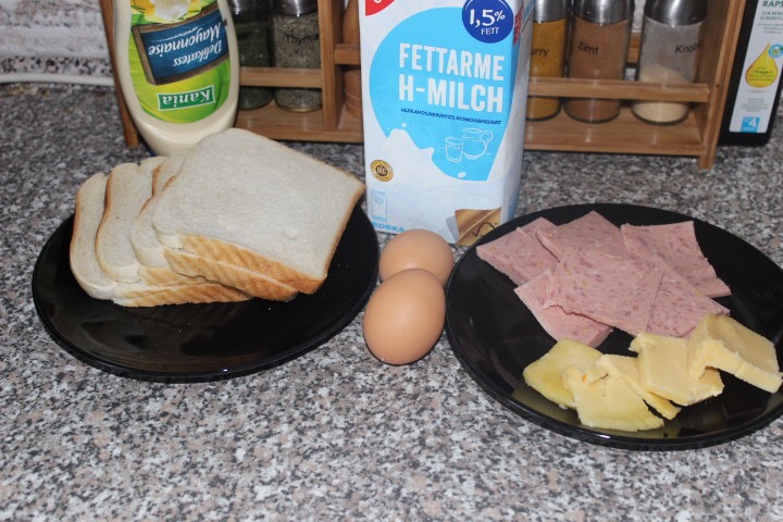 Нам понадобится 4 кусочка хлеба, у меня тосторный, горчица или маонез, ветчина или колбаса, сыр и два яйца и пару ложек молока для кляра