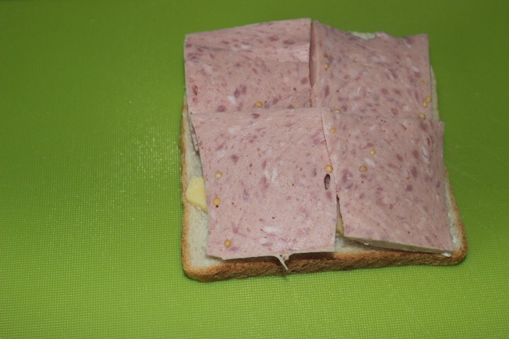 Смазываем наш хлеб горчицей или майонезом, укладываем начинку и закрываем второй половинкой хлеба